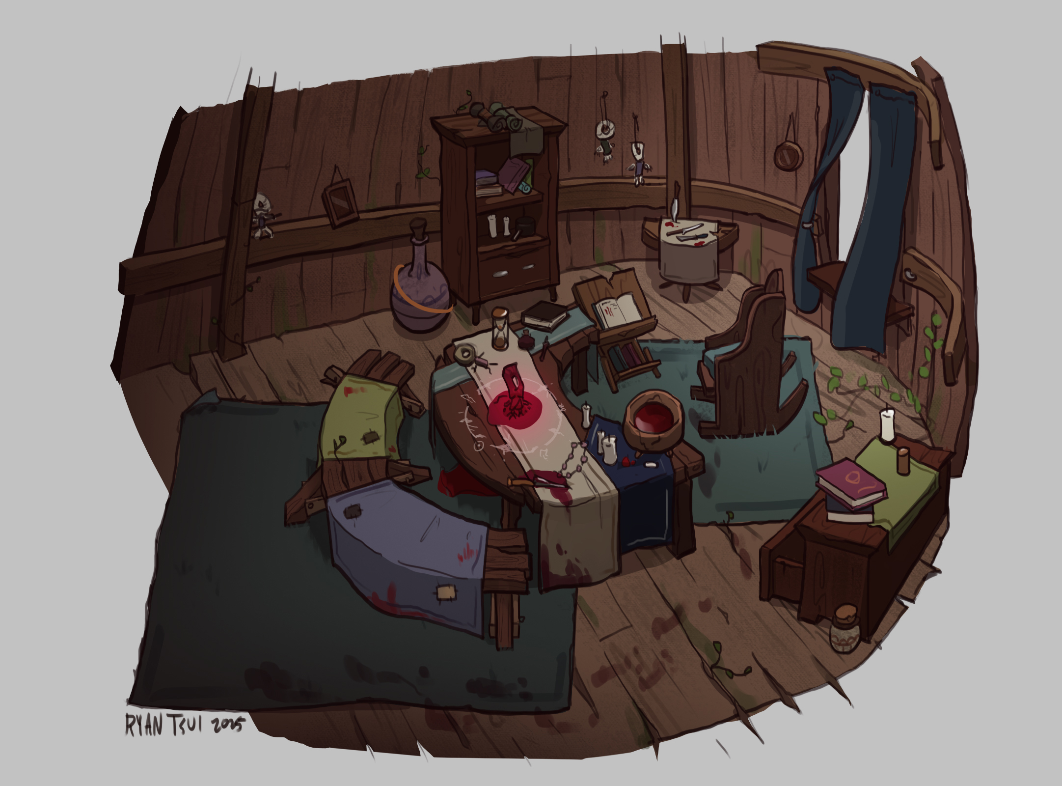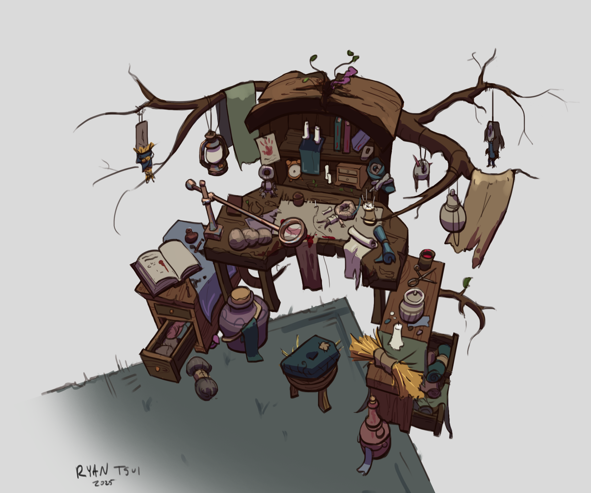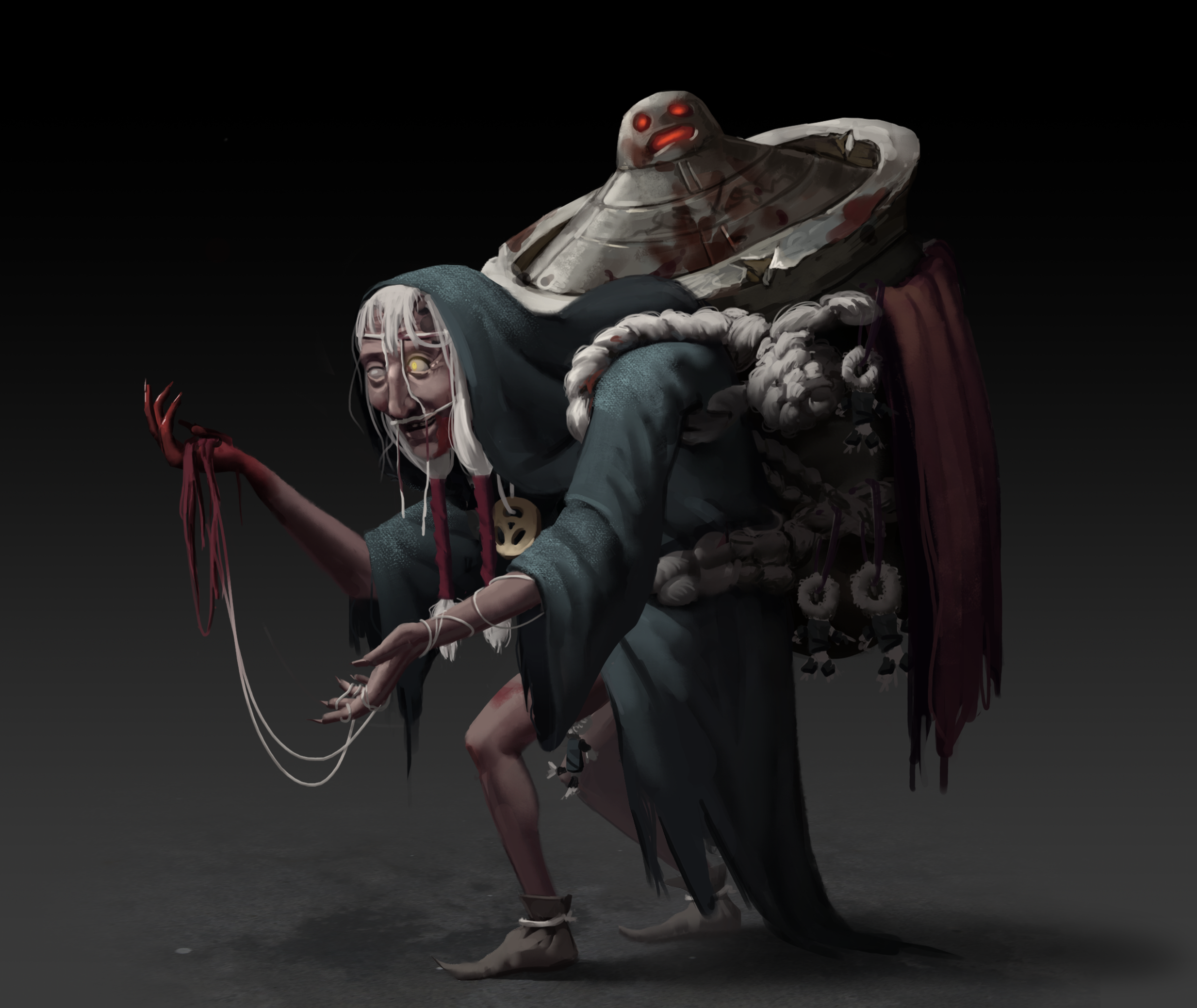 The String Fortune Teller (SFT) was once an enlisted mage in their country’s military. They suffered a head injury where they slowly started seeing visions and hallucinations. She repeatedly sought help from her country but was always ignored. She slowly started going crazy and now resides in the swamp where she tells fortunes using dolls soaked in her client’s blood.